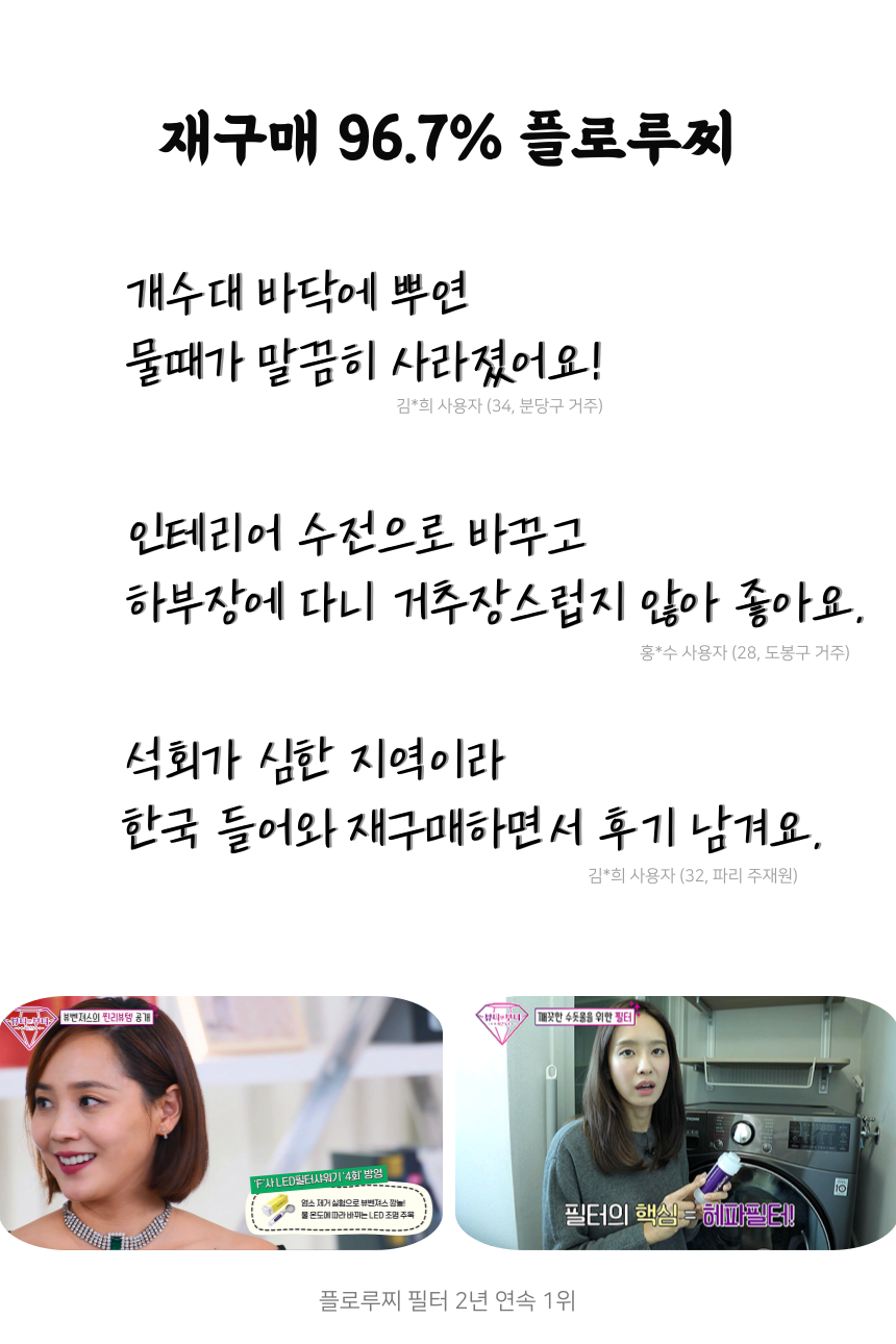 대한민국 특허청 등록된 석회 제거 정수 기술로 한국에서 생산된 플로루찌 필터입니다.