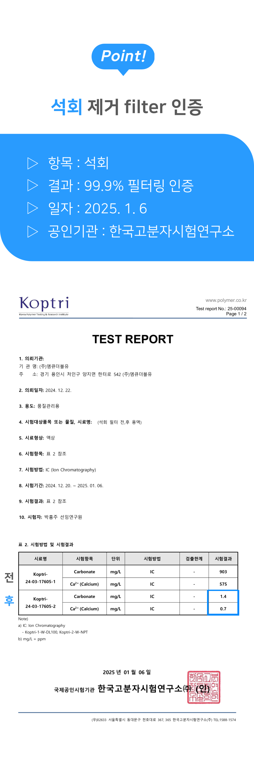 시험결과: 99.9% 석회 필터링 인증