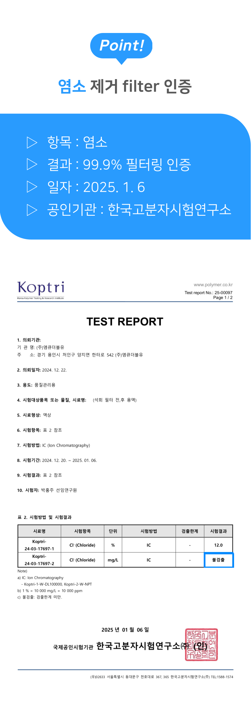 국제 공인 기관인 한국고분자시험연구소로부터 획득한 시험성적서를 확인.