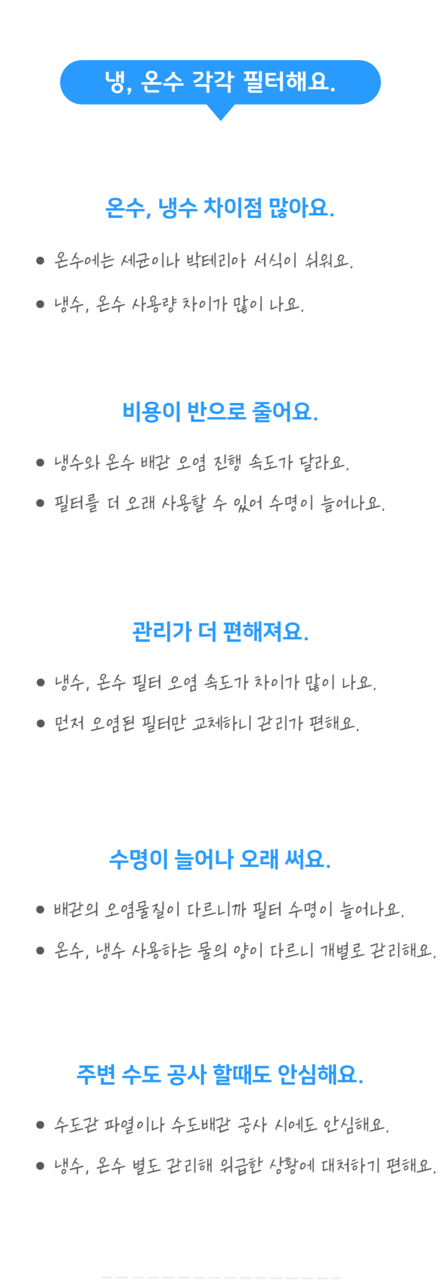 - 냉수·온수 각각 설치 가능; 위생 관리에 유리